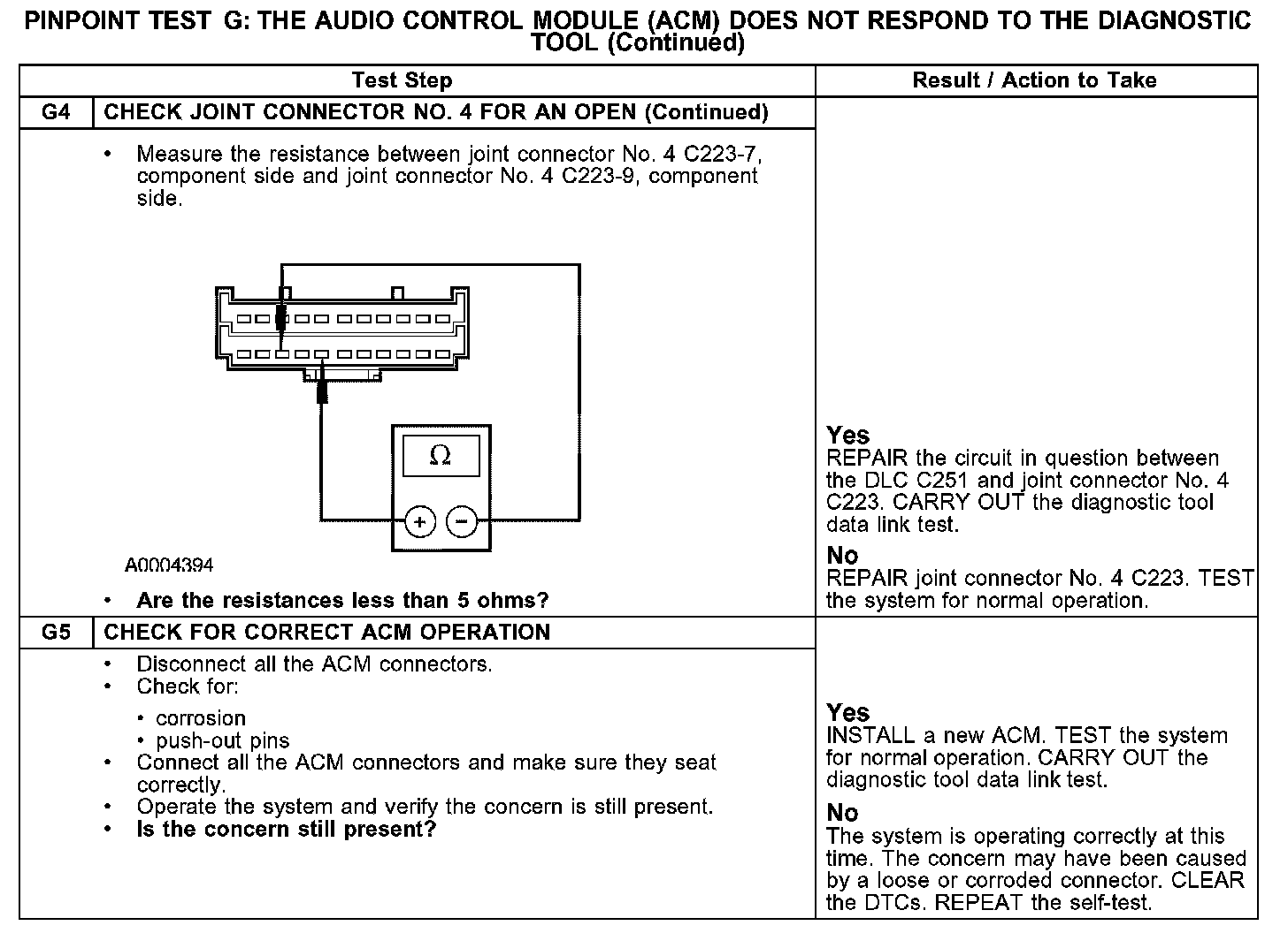 PINPOINT TEST G: THE AUDIO CONTROL MODULE (ACM) DOES NOT RESPOND TO THE DIAGNOSTIC TOOLG1-G3:
