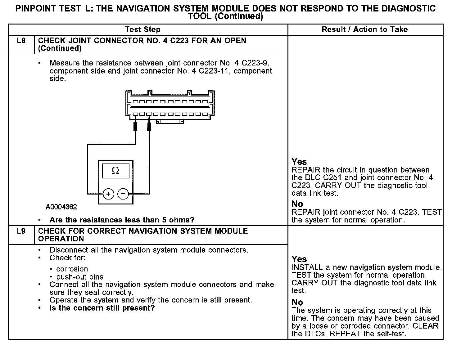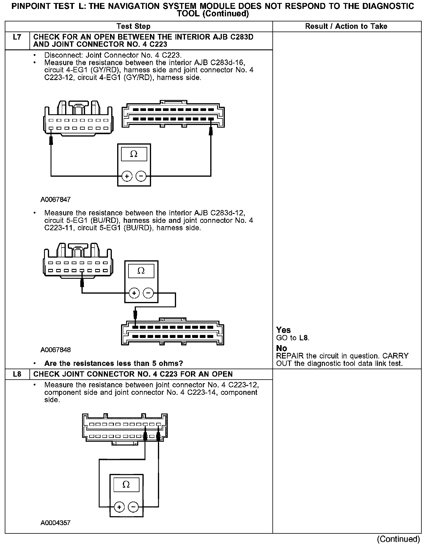 The navigation system module communicates with the diagnostic tool through the standard corporate protocol (SCP) communications network circuits 4-EG17 (GY/BK) and 5-EG17 (BU/YE). If one of the SCP communications network become shorted to ground or voltage, or if some but not all termination resistors are lost, communications can continue. Check circuits 4-EG17 (GY/BK) and 5-EG17 (BU/YE) between the navigation system module C4209 and the data link connector (DLC) C251. The total resistance values must not be more than 5 ohms. If the resistance is more than 5 ohms, there is either an open in circuit 4-EG17 (GY/BK) and 5-EG17 (BU/YE), damage to the DLC C251, damage to the navigation system module C4209, or a problem in the interior auxiliary junction box (AJB) C283b, interior AJB C283d, joint connector No. 4 C223 or joint connector No. 5 C427.
