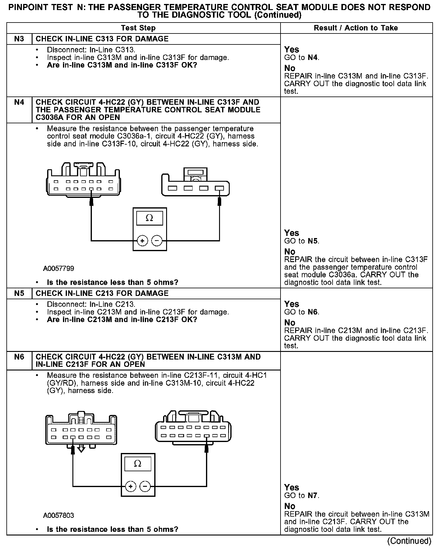 The passenger temperature control seat module communicates with the diagnostic tool through the universal asynchronous receiver-transmitter (UART)-based protocol (UBP) communications network circuit 4-HC22 (GY). If circuit 4-HC22 (GY) becomes open or shorted to ground, communications to that module are not possible. Check circuit 4-HC22 (GY) between the passenger temperature control seat module and the data link connector (DLC) C251. The total resistance value must not be more than 5 ohms. If the resistance is more than 5 ohms, there is either an open in circuit 4-HC22 (GY), damage to the DLC C251, damage to the passenger temperature control seat module C3036a, or a problem with in-line C213, in-line C313 or joint connector No. 1 C261.