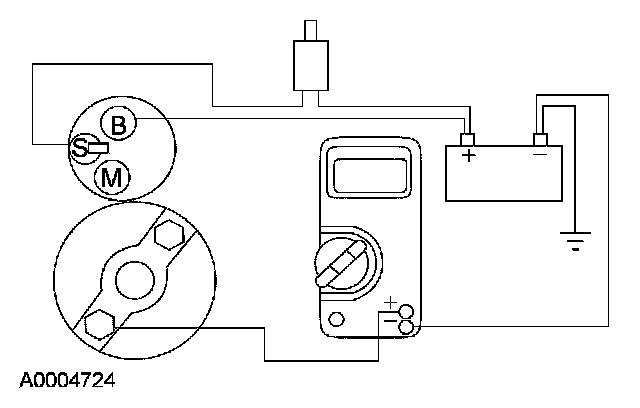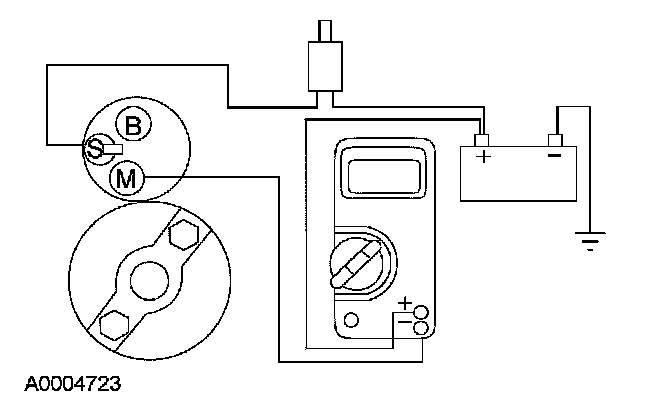 8. Remove the cables from solenoid B-, S- and M-terminals. Clean the cables and connections and reinstall the cables to the correct terminals. Repeat Steps 3 through 6. If the voltage drop reading is still greater than 0.8 volt when checked at the M-terminal and less than 0.8 volt when checked at the B-terminal, the concern is in the solenoid contacts. Install a new starter motor.