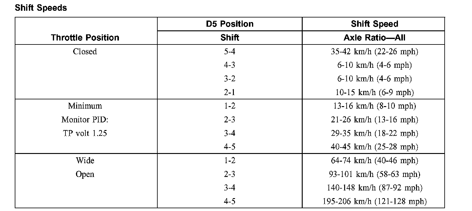4. Stop the vehicle. Select the D4 position. Repeat Step 3. The transmission will make all upshifts except 4-5 and the torque converter clutch (TCC) should apply above 46 km/h (27 mph).
