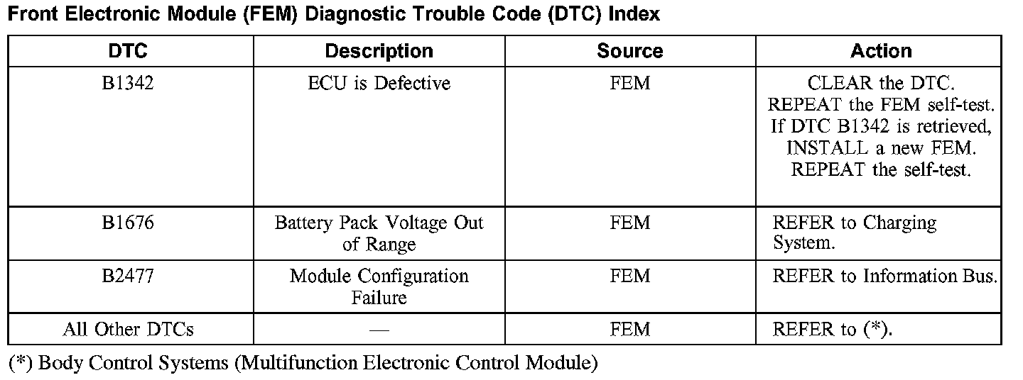 Front Electronic Module (FEM) Diagnostic Trouble Code (DTC) Index