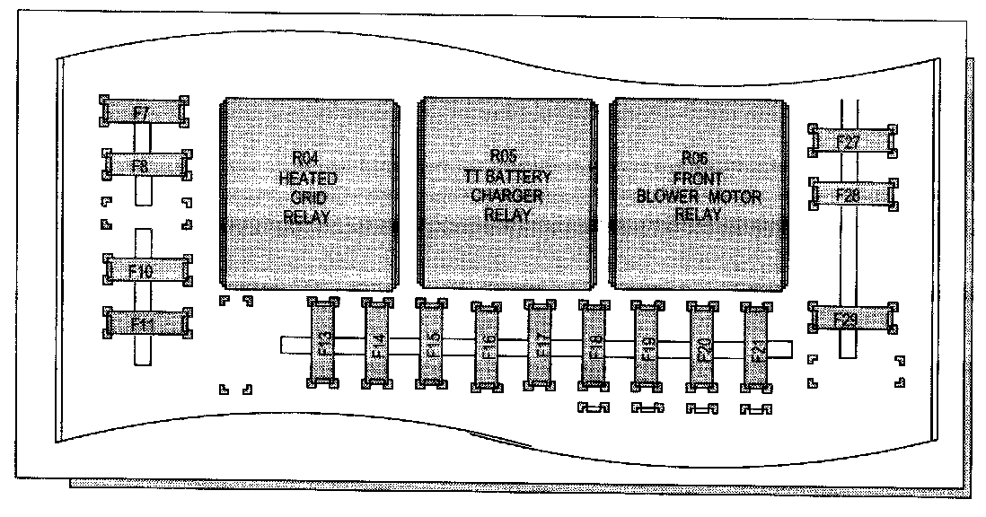 Fuse and Relay Information contains a view of the fuse-/relay box in which all fuses and relays are identified. Fuse and relay numbering and naming follow the indication of the fuse panel cover.