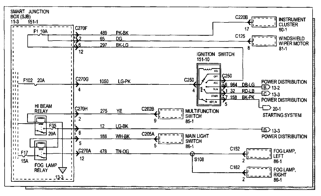 Power and Ground Distribution Diagrams shows the current feed circuits. The current path is shown from the battery to the ignition switch and to all fuses. It also shows the circuits protected by each fuse. The circuit is traces from the fuse to the component. All details (wires, splices, connectors) between the fuse and the first component are shown.