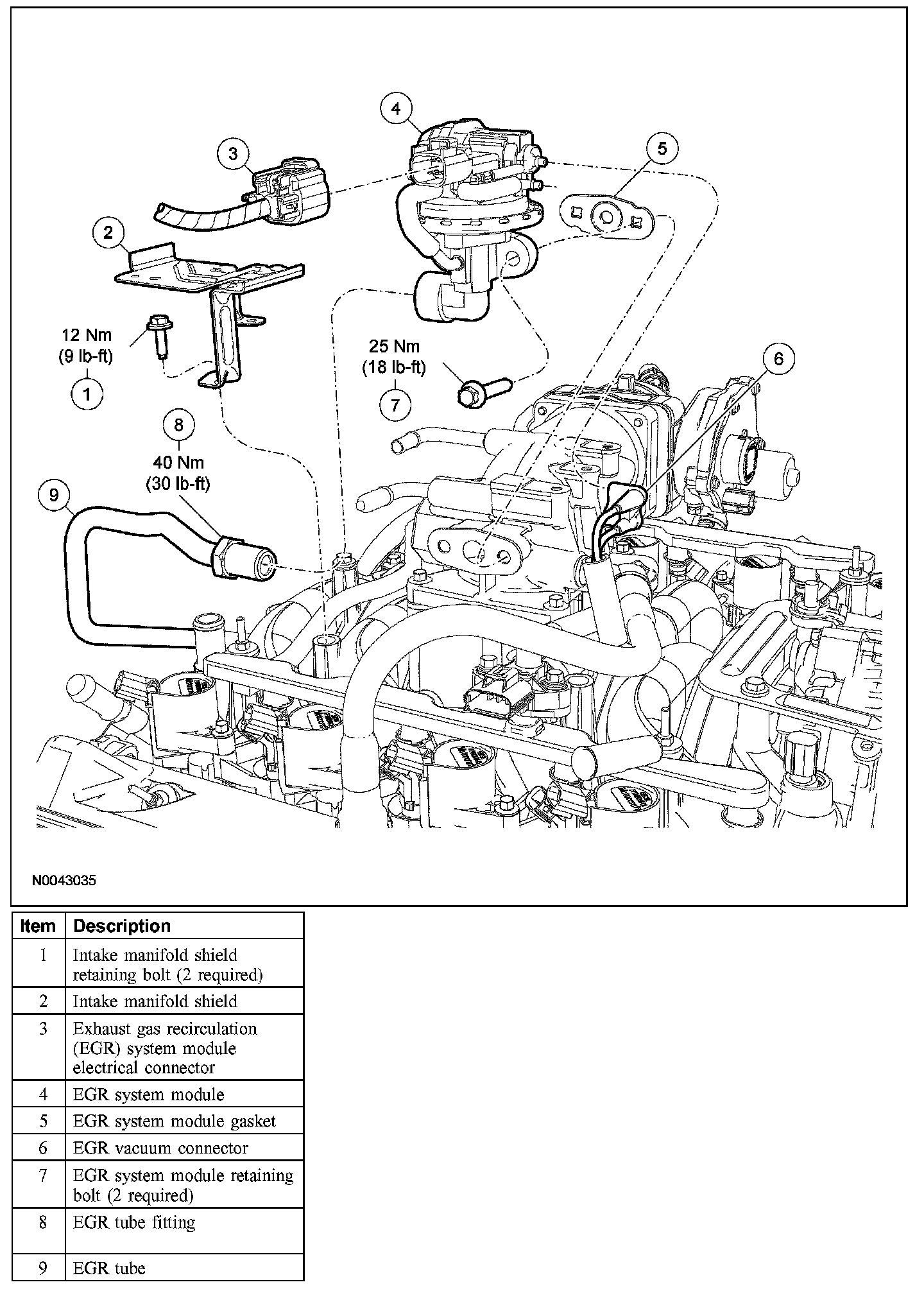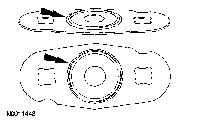 - Install a new EGR system module gasket with the side that has the raised circle facing the intake manifold.