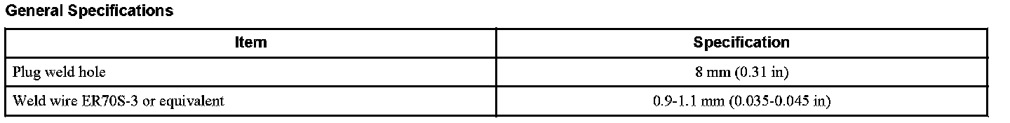 - Factory spot welds may be substituted with either STRW or MIG plug welds. Spot/plug welds should equal factory welds in both location and quantity. Do not place a new spot weld directly over an original weld location. Plug weld hole should equal 8 mm (0.31 in) diameter.