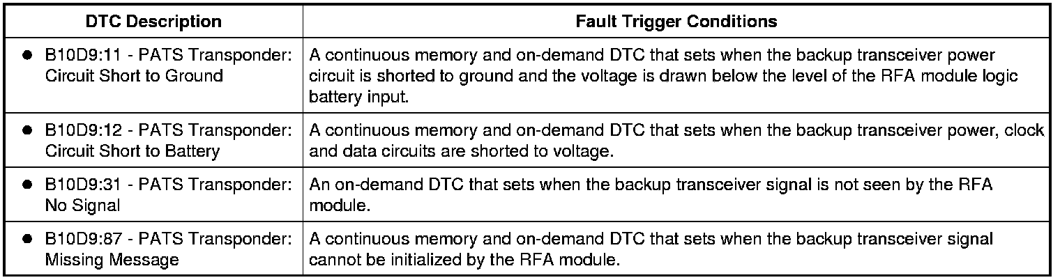 The Remote Function Actuator (RFA) module uses the backup transceiver to operate the Passive Anti-Theft System (PATS) in the event of a failure of any passive start antenna, the battery in the Intelligent Access (IA) key, or the Remote Functions Receiver (RFR) module. It is also used for IA key programming.