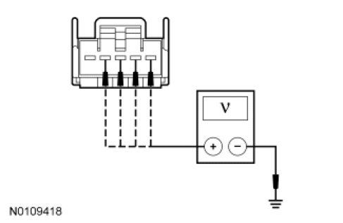 - Measure the voltage between the backup transceiver C2086-2, circuit VPK33 (WH), C2086-3, circuit VPK32 (WH/BU), C2086-4, circuit RPK32 (YE/GY), and C2086-5, circuit LPK32 (GN/BU), harness side and ground.