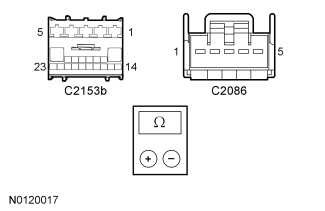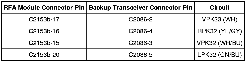 - Measure the resistance between the RFA module C2153b, harness side and the backup transceiver C2086, harness side as follows: