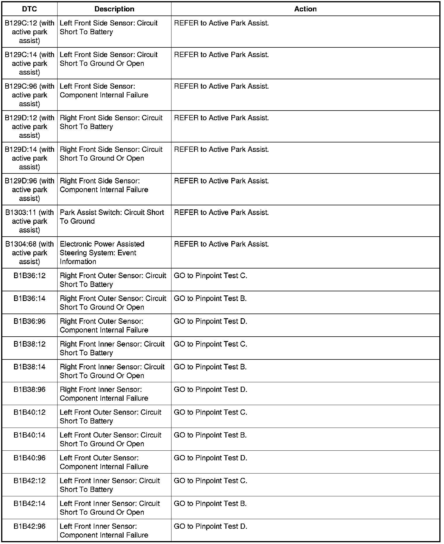 Parking Aid Module (PAM) DTC Chart