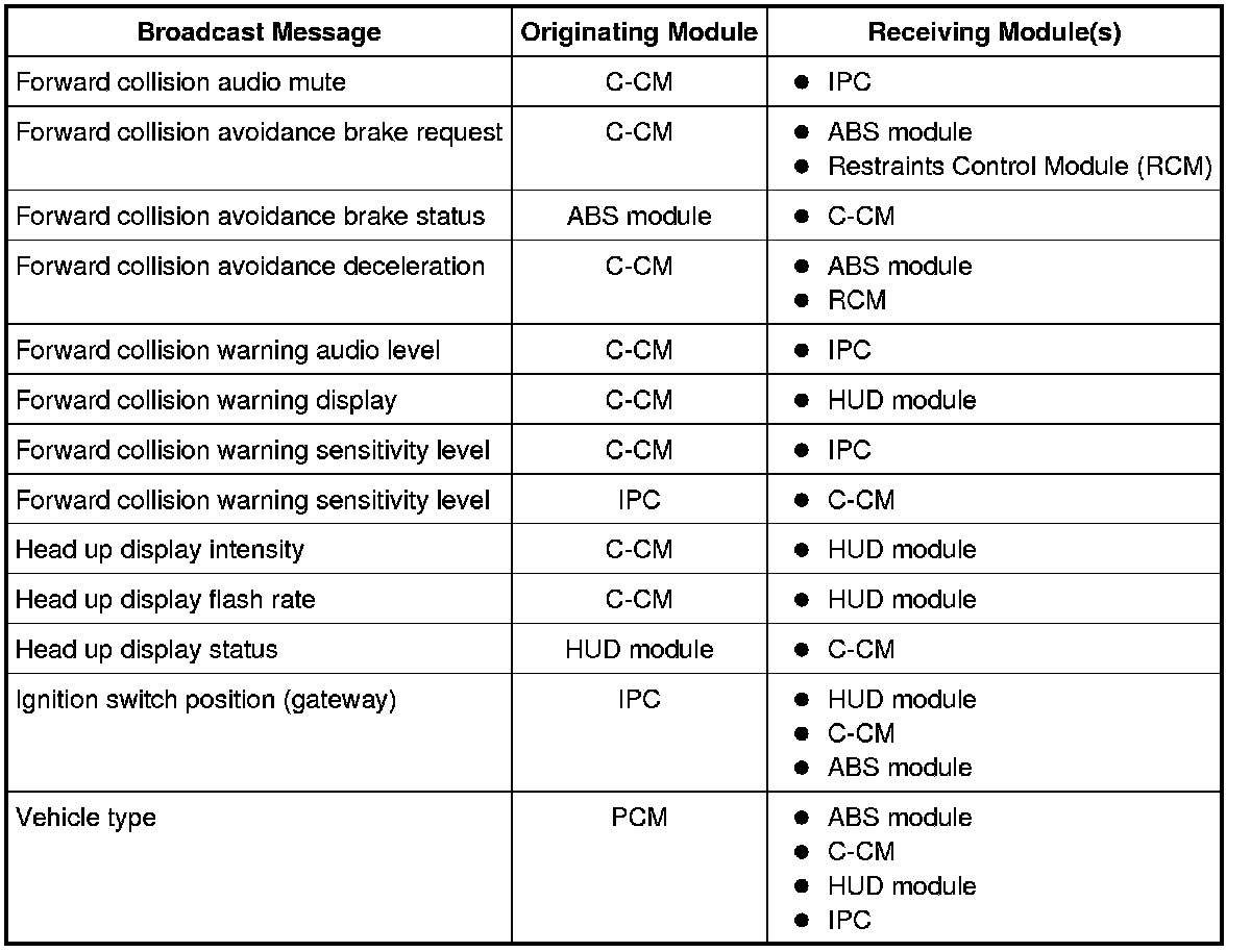 NOTE: While there are numerous messages internal to the HUD module, the following messages are utilized by the forward collision warning system in conjunction with outside systems.