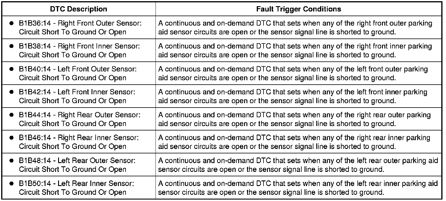 The Parking Aid Module (PAM) supplies a reference voltage and signal return to the parking aid sensors. A fault condition occurs when the PAM detects an open in the front (if equipped) or rear parking aid sensor circuits or the front or rear parking aid sensor input signal is open or shorted to ground.