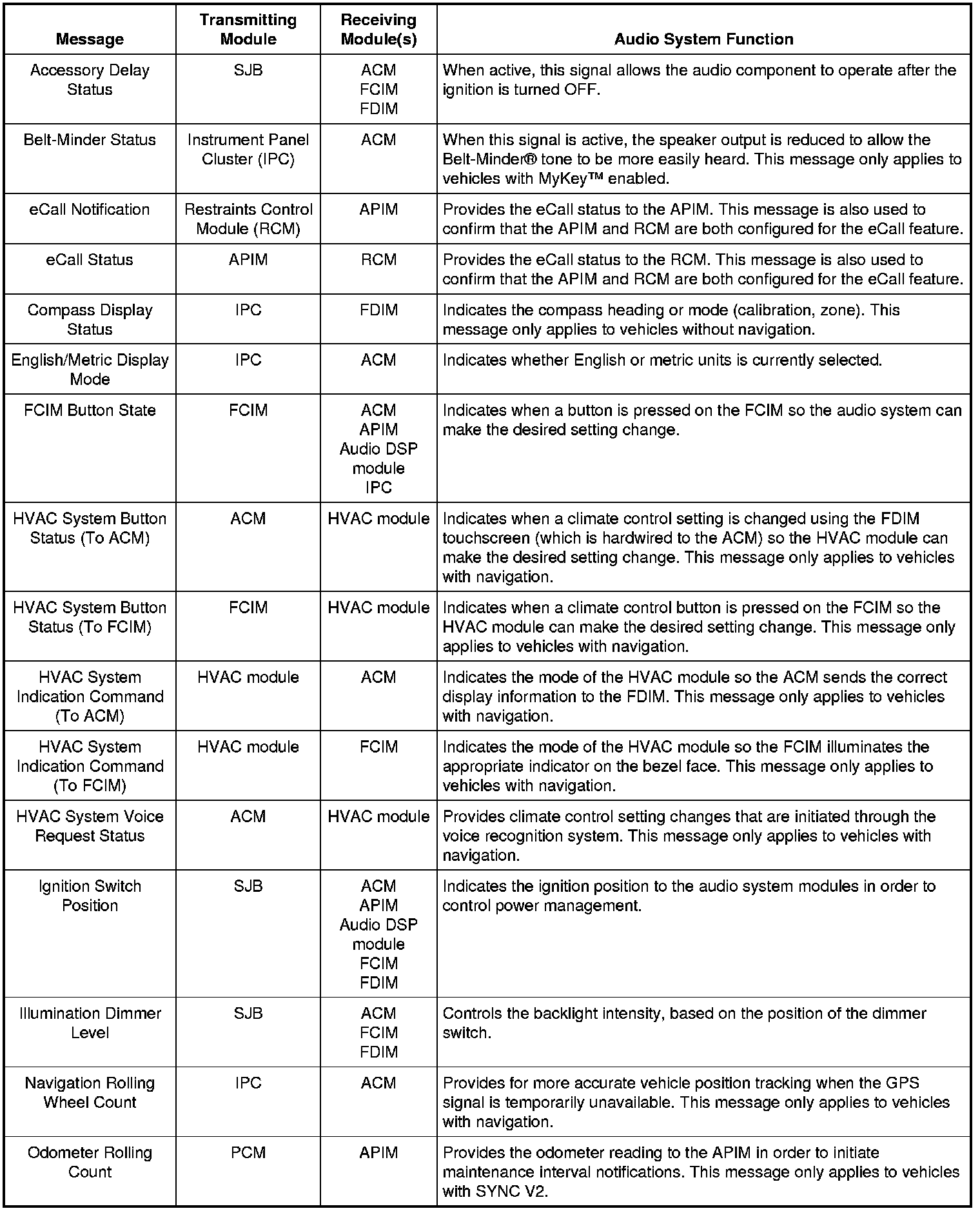 When the audio system enters voice recognition mode, the ACM initially controls the voice recognition feature. The microphone is wired directly to the APIM, which relays the microphone input to the ACM through dedicated wiring. If the first command spoken is part of the ACM voice recognition set, the ACM retains control of the voice recognition and takes the appropriate action(s). If the first command spoken is part of the APIM voice recognition set, the ACM shuts off its own voice recognition and broadcasts a Controller Area Network (CAN) message to the APIM, transferring the voice recognition to the SYNC system and providing the voice command that was spoken. The ACM controls the voice engine for the base audio, navigation, and climate control systems. The APIM controls the voice engine for the SYNC system (USB port, audio input jack, Bluetooth).