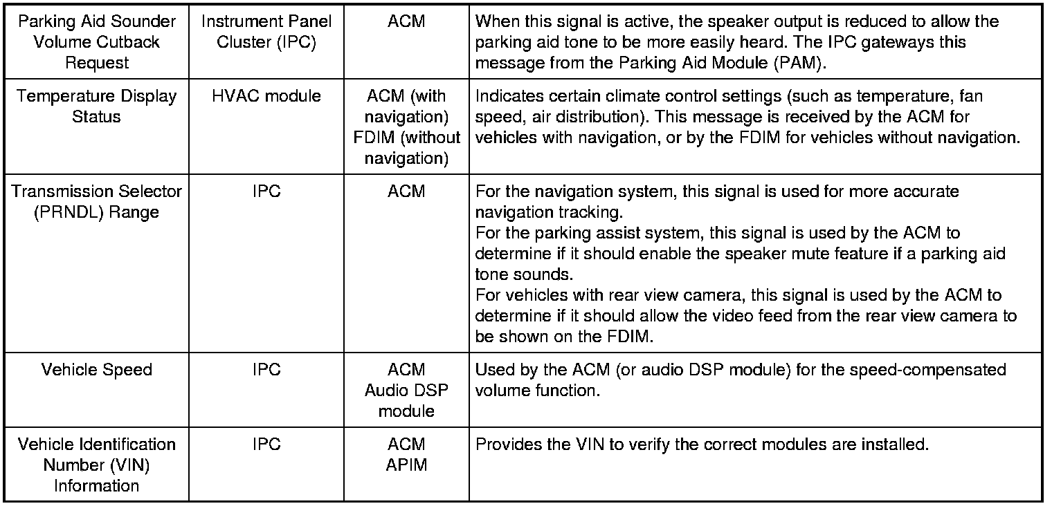 For vehicles with navigation, the FDIM is hardwired to the ACM. When the touchscreen is pressed, a signal is sent to the ACM, which acts on the signal either by changing the audio setting or by sending a message via the MS-CAN to the module controlling the function that was selected. The audio system, navigation, and climate control video feed to the FDIM is provided by the ACM. If equipped with a rear view camera, the video feed for the camera is provided by the rear view camera when the vehicle is in REVERSE.