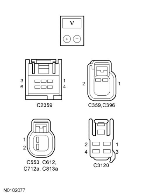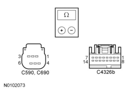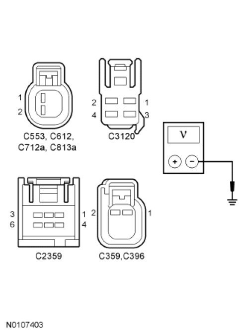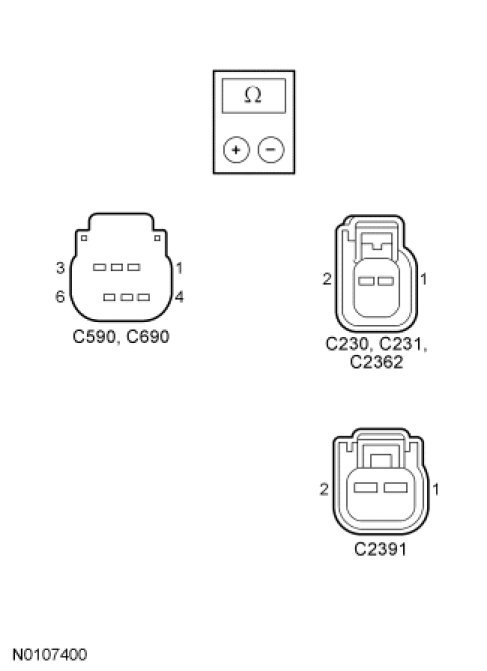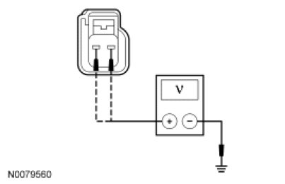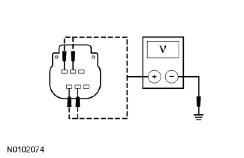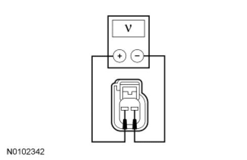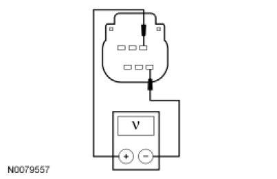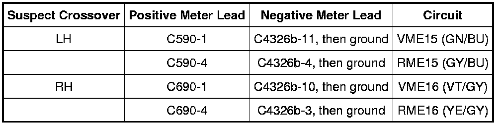 - Measure the AC voltage between the LH crossover C590-1, circuit VME15 (GN/BU), harness side and the LH crossover C590-4, circuit RME15 (GY/BU), harness side; or between the RH crossover C690-1, circuit VME16 (VT/GY), harness side and the RH crossover C690-4, circuit RME16 (YE/GY), harness side.