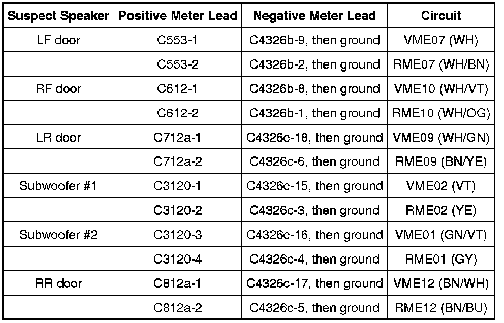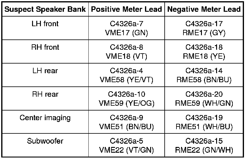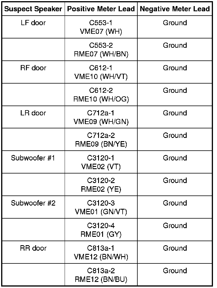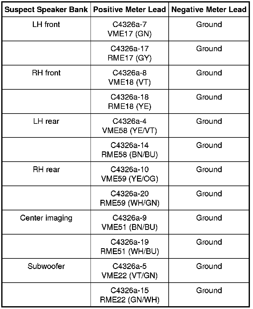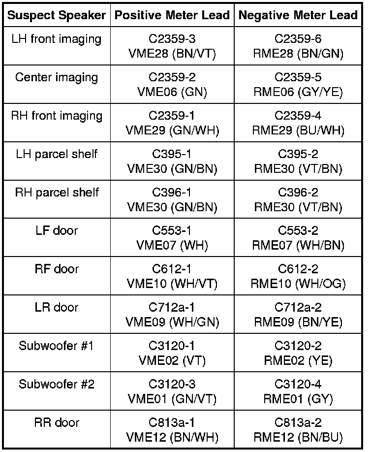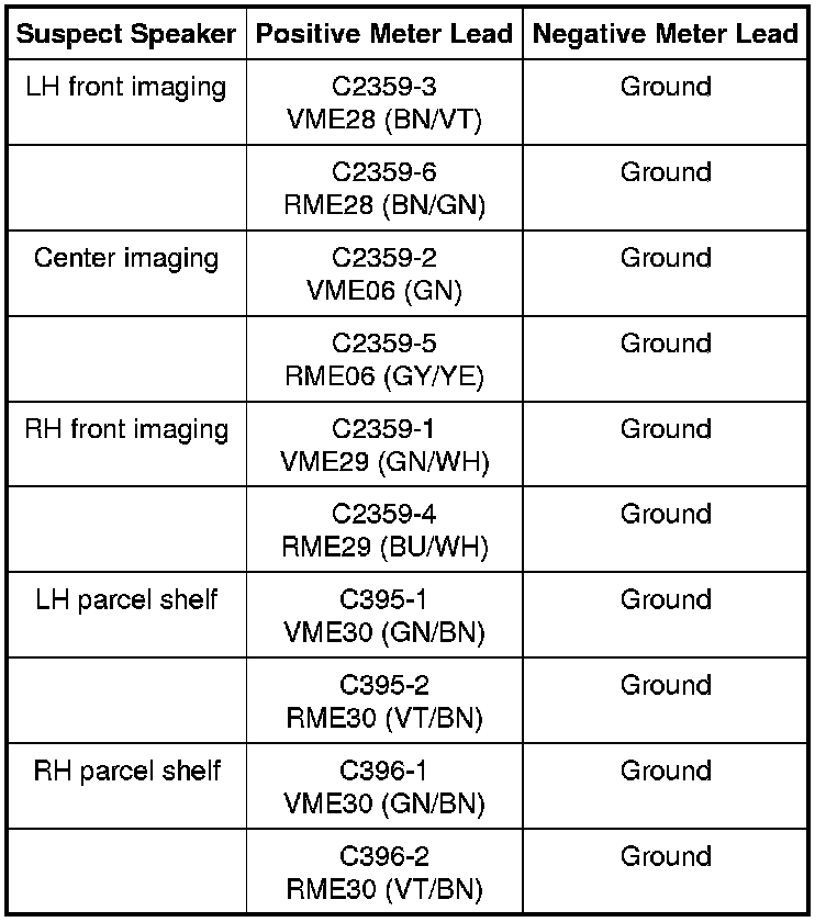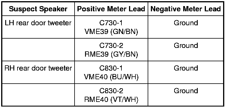 - Measure the AC voltage between the LH rear door tweeter speaker C730-1, circuit VME39 (GN/BN), harness side and the LH rear door tweeter speaker C730-2, circuit RME39 (GY/BN), harness side; or between the RH rear door tweeter speaker C830-1, circuit VME40 (BU/WH), harness side and the RH rear door tweeter speaker C830-2, circuit RME40 (VT/WH), harness side.