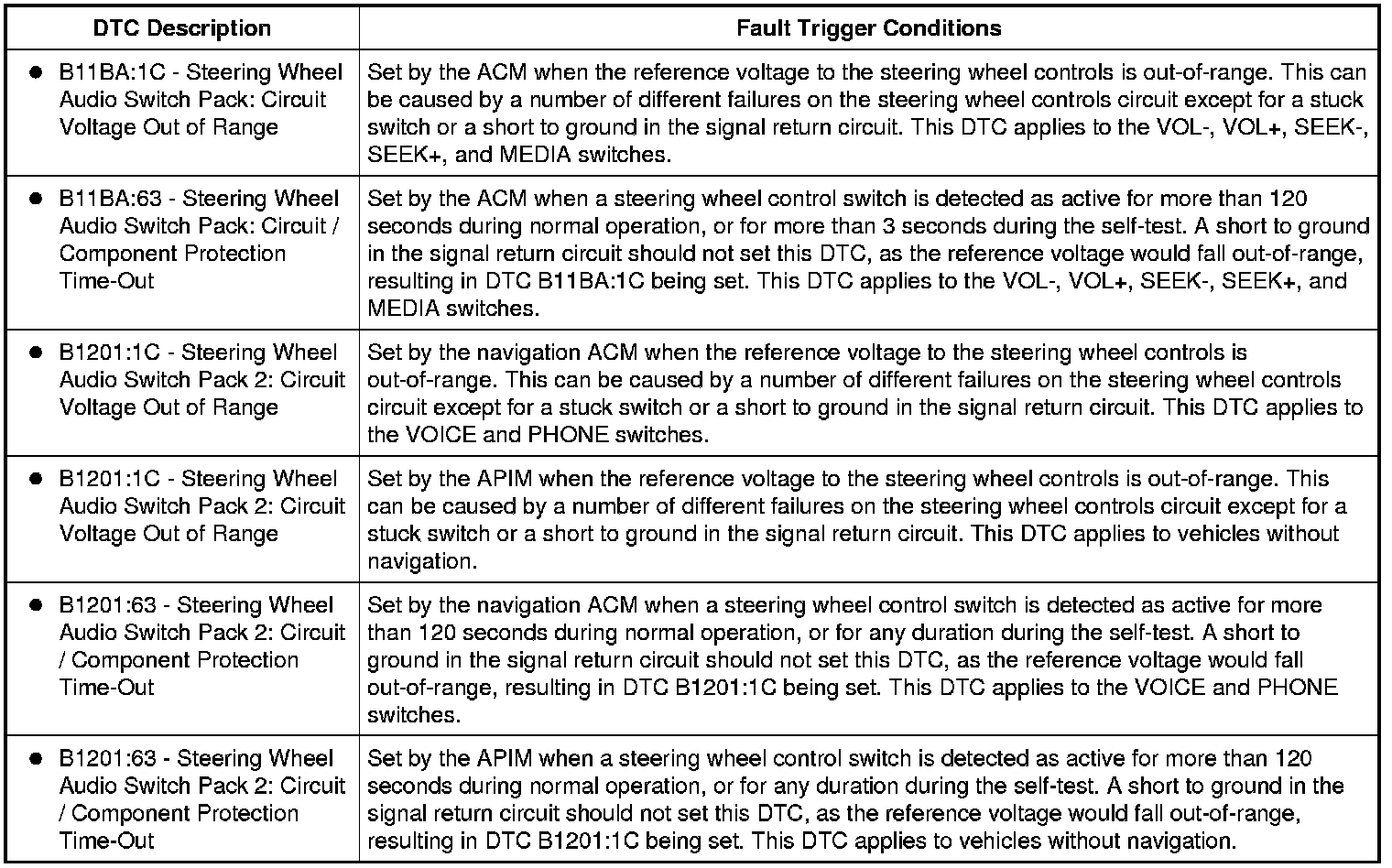 The VOICE (an icon of someone speaking), PHONE (an icon of a phone receiver and an up/down arrow), and OK switches are wired to the Accessory Protocol Interface Module (APIM) unless the vehicle is equipped with navigation, in which case the VOICE and PHONE switches are wired to the ACM, and there is no OK switch. Voltage is sent from the APIM (or ACM if equipped with navigation) to the steering wheel controls, and the APIM (or ACM if equipped with navigation) grounds the reference voltage.
