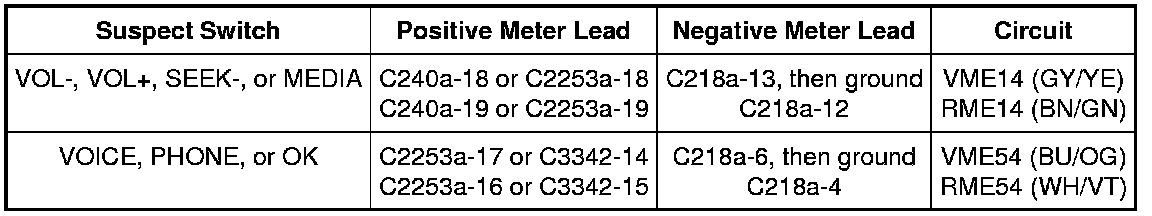 - For a concern with the VOL-, VOL+, SEEK-, SEEK+, or MEDIA switches, measure the voltage between the clockspring C218a-13, circuit VME14 (GY/YE), harness side and ground.