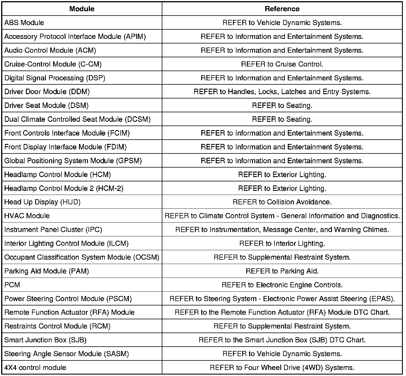 Each module has a comprehensive DTC chart listed in the appropriate information.. Refer to the table below for the reference of a specific module DTC chart.