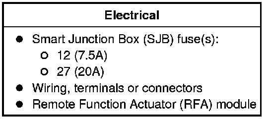 9. If the DTCs retrieved are related to the concern, go to DTC Charts Remote Function Actuator (RFA) Module. For all other DTCs, refer to the Diagnostic Trouble Code (DTC) Chart in Multifunction Electronic Modules Testing and Inspection.