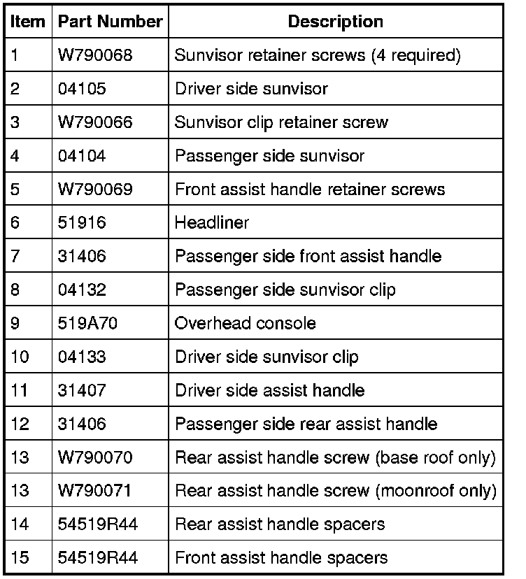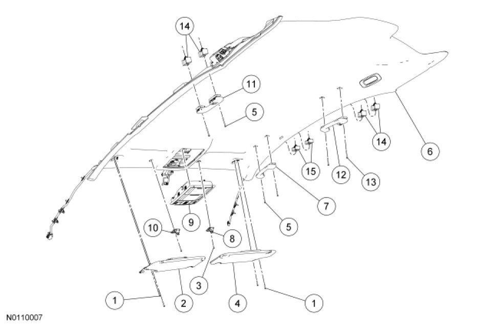 15. Remove the overhead console. For additional information, refer to Instrument Panel and Console Console - Overhead.
