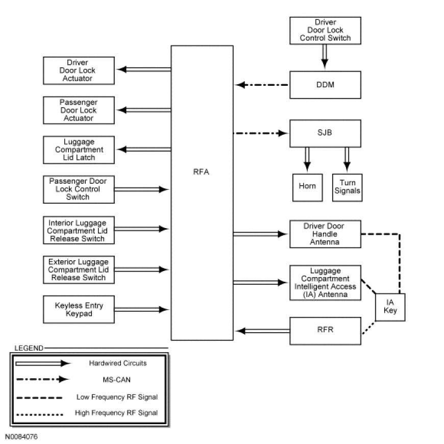 Regardless of the key position, the RFA module and the Driver Door Module (DDM) are supplied voltage at all times. When the RFA module receives a signal from the Intelligent Access (IA) key through the Remote Functions Receiver (RFR) module, the keyless entry keypad, or the RH door lock control switch, it sends a ground signal to the lock and unlock relays. When the LH door lock control switch is pressed, the DDM receives the lock or unlock signal. The DDM sends a request through the Medium Speed Controller Area Network (MS-CAN) to the RFA module to lock or unlock the doors.