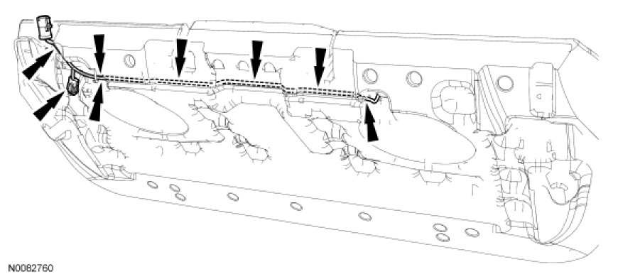 2. From underneath the cushion foam pad, route the RH cushion heater mat wire harness into the cushion foam pad trench and out the other side. Attach the wire harness retainer and connect the LH cushion heater mat electrical connector to the RH cushion heater mat electrical connector.