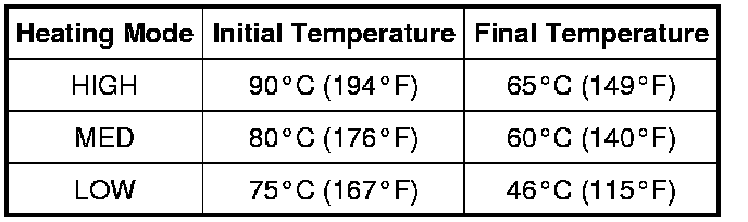 - When heating, the DCSM will vary the speed of the fans and the TED duty cycle in order to reach and maintain the temperature determined by the switch setting (closed loop operation). Refer to the following table for heating mode temperatures.