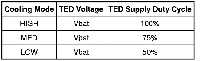 - When cooling, the DCSM maintains constant speed of the fans and constant TED supply voltage (duty cycle) in open loop COOL mode (refer to the following table).