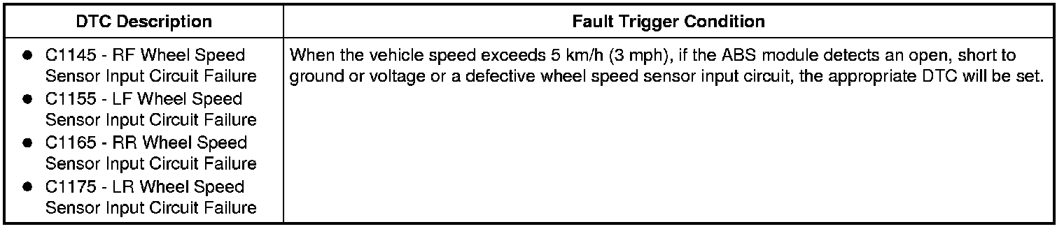 INSPECT the wheel speed sensors, wheel speed sensor wiring and wheel speed sensor tone rings. REPAIR or INSTALL new as necessary. If any other DTCs are retrieved, GO to the ABS Module DTC Chart. ABS Module DTC Chart