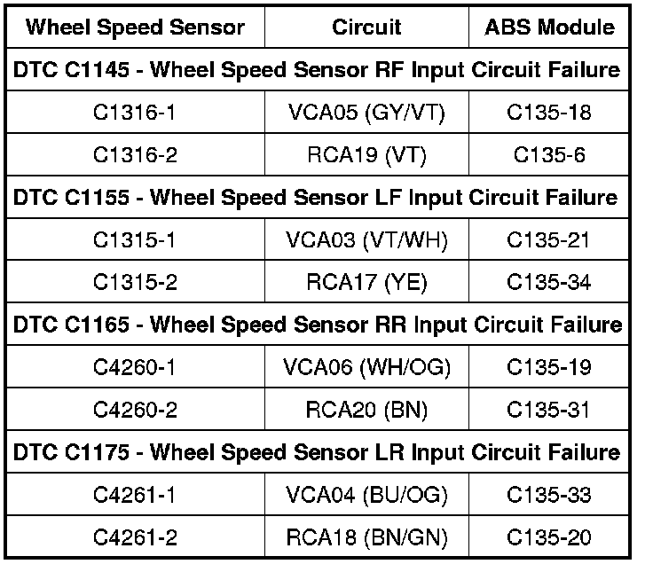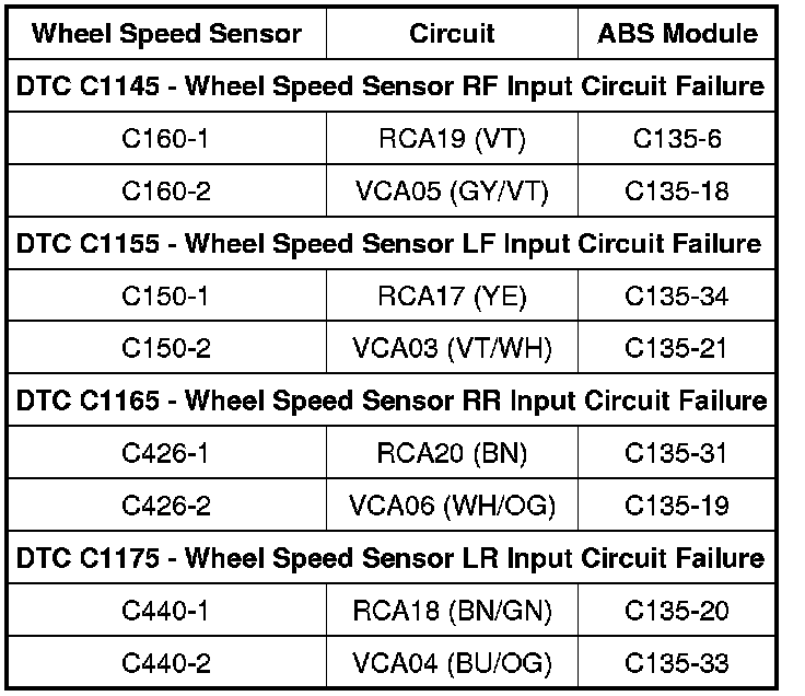 - For all other vehicles: Measure the resistance between the ABS module connector, harness side and the suspect wheel speed sensor connector, harness side as indicated in the following chart: