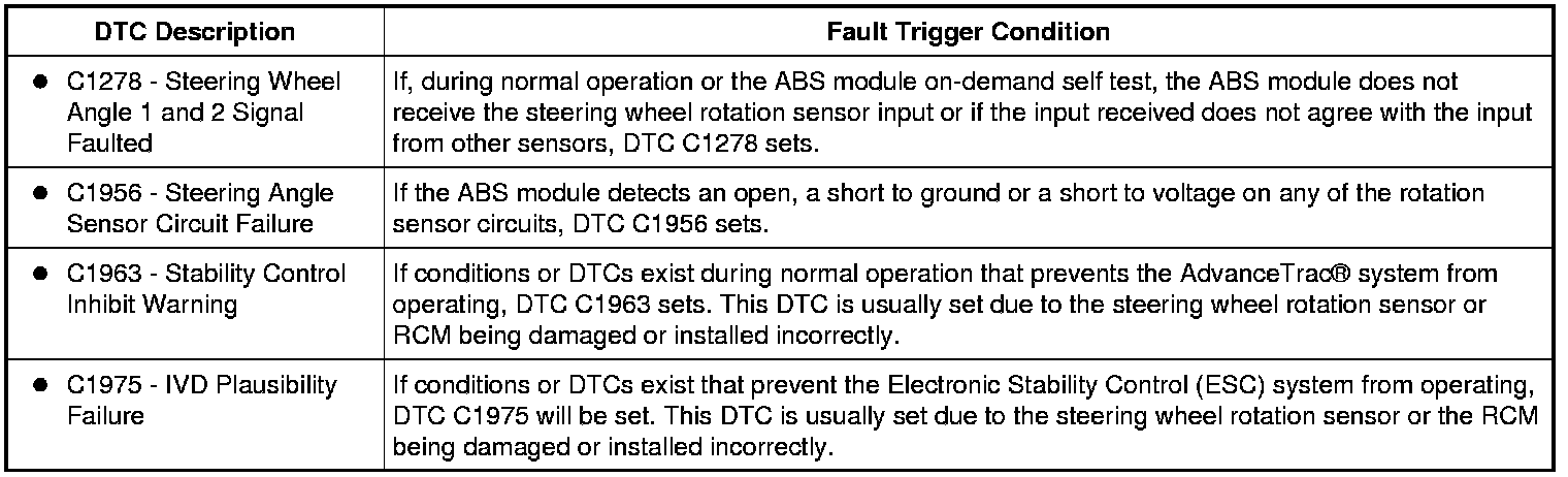 Fused ignition voltage is supplied to the rotation sensor from Smart Junction Box (SJB) fuse 35 (10A) along circuit CBP35 (YE/GY). Ground for the sensor is provided by the ABS module along circuit RCS06 (BN/VT). The steering wheel rotation sensor sends information to the ABS module along circuits VCS06 (GY/BN) and VCS07 (VT/OG). If the ground or power to the steering wheel rotation sensor is interrupted, DTC C1278 sets.