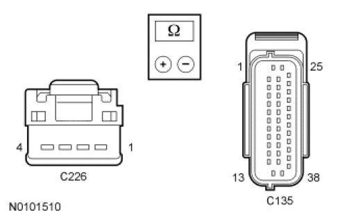 - Measure the resistance between steering wheel rotation sensor C226-3, VCS07 (VT/OG), harness side and steering wheel rotation sensor C226-2, circuit VCS06 (GY/BN), harness side.