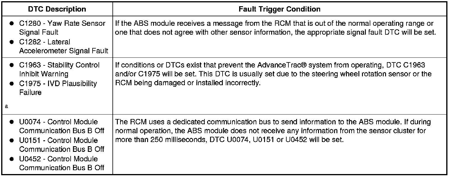 The Restraints Control Module (RCM) measures the yaw rate and vehicle acceleration, then sends the signal through a secondary, dedicated Controller Area Network (CAN) bus to the ABS module. The ABS module uses this information for AdvanceTrac(R) system operation. The ABS module also compares this information to information it receives from other sensors (brake pedal input, steering wheel, etc.) to determine how valid the information is and to determine if an instability event is about to occur.