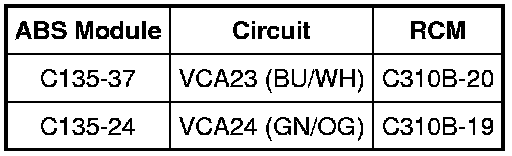 The RCM and the ABS module communicate along circuits VCA23 (BU/WH) and VCA24 (GN/OG). An open circuit or a short to power or ground on any one of these circuits will cause the ABS module to set a DTC. Also, if the RCM is not mounted in the correct position, with the electrical connector facing the rear of the vehicle, the ABS module will also set DTCs.