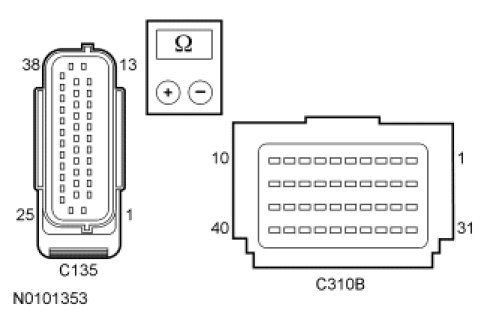- Measure the resistance between the ABS module C135, harness side and the RCM C310B, harness side as indicated in the following chart: