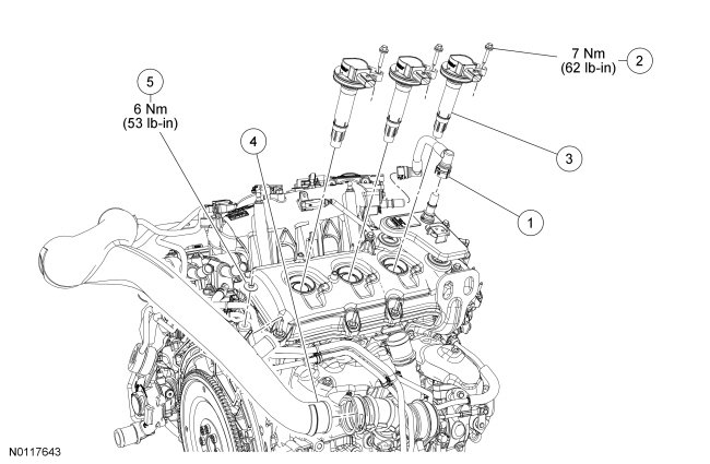 6. Install 3 RH ignition coil-on-plugs and the 3 bolts.