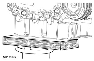 2. NOTICE: Failure to position the wood block and floor jack as illustrated can result in damage to the oil pan.