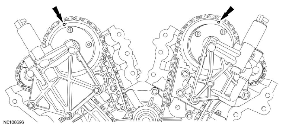 4. Install the primary timing chain with the colored links aligned with the timing marks on the VCT assemblies and the crankshaft sprocket.