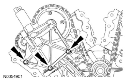 10. Remove the 2 bolts and the lower LH primary timing chain guide.