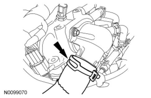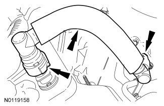 19. Disconnect the 2 quick connect couplings and remove the PCV tube. For additional information, refer to Fuel System - General Information Service and Repair.