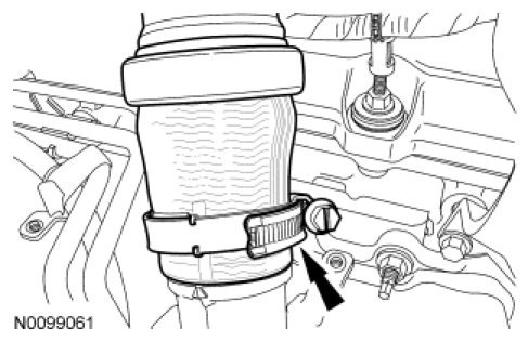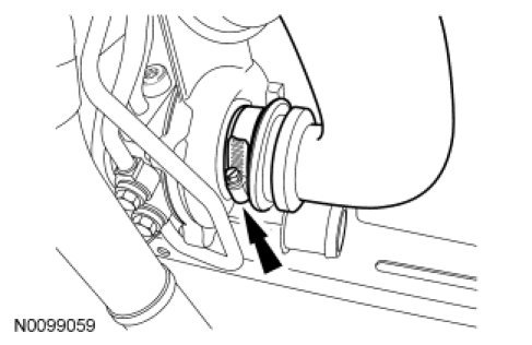 17. NOTICE: The compression limiter bushing may fall out of the mounting bracket grommet on the Charge Air Cooler (CAC) tube during service. Make sure the bushing is in place when reinstalling the tube or damage to the tube may occur.