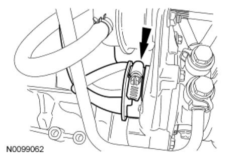 14. Loosen the clamp and remove the RH CAC tube from the RH turbocharger.