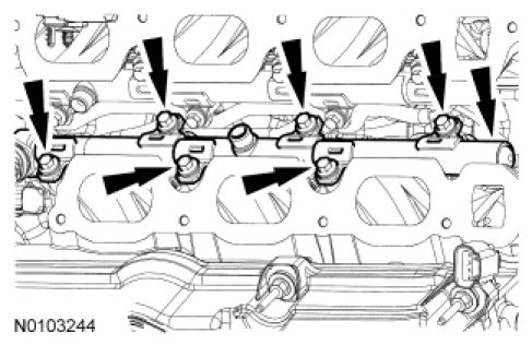 NOTE: Use compressed air to remove any dirt or foreign material from the cylinder head, block and the general surrounding area of the fuel rails and injectors.