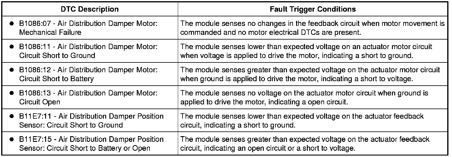 For DTC B1086:07, INSPECT for binding/damaged linkage or door. REPAIR as necessary. If no condition is found, INSTALL a new defrost/panel/floor mode door actuator. CONNECT the actuator electrical connector before the HVAC module connector(s). This will allow the new actuator to be calibrated when the HVAC module is reconnected. CLEAR the DTCs. REPEAT the self-test. TEST the system for normal operation.