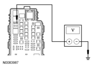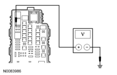 - Measure the voltage between the reversing lamps relay pin 2, circuit CLS28 (BU/WH), BJB face side and ground.