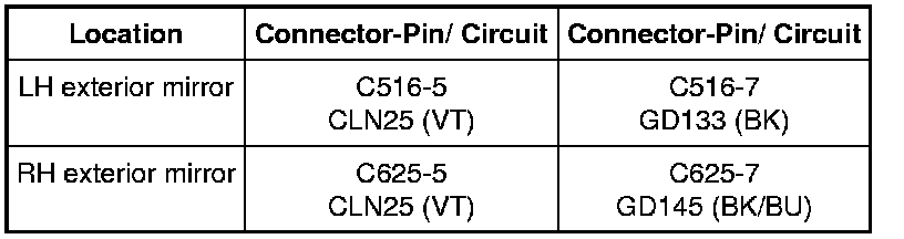 - Measure the voltage between the LH exterior mirror connector C516-5, circuit CLN25 (VT), harness side and ground; or between the RH exterior mirror connector C625-5, circuit CLN25 (VT), harness side and ground.