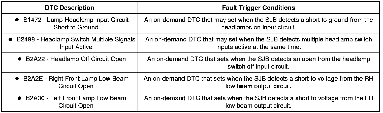 If the SJB detects a concern with any of the headlamp switch inputs for 5 seconds (multiple headlamp switch inputs active at the same time or no inputs active), the SJB turns the exterior lamps on.