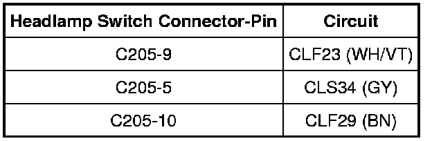 - Measure the voltage between headlamp switch C205-9, circuit CLF23 (WH/VT), harness side and the headlamp switch C205-7, circuit GD116 (BK/VT), harness side.