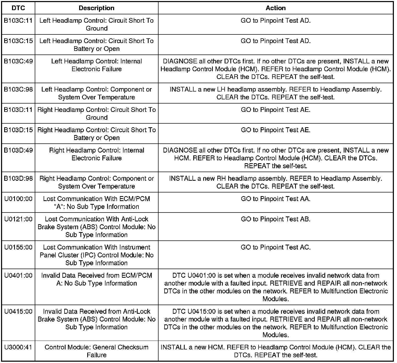 NOTE: This module utilizes a 5-character DTC followed by a 2-character failure-type code. The failure-type code provides information about specific fault conditions such as opens, or shorts to ground. Continuous memory DTCs have an additional 2-character DTC status code suffix to assist in determining DTC history.